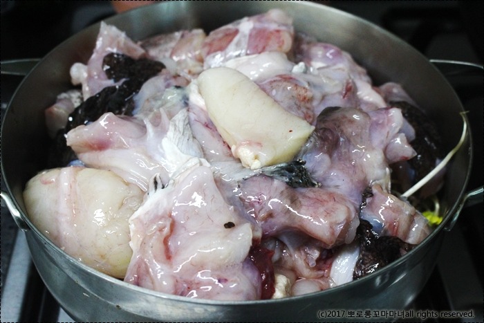 손질한 아귀를 넣어서 뚜껑 닫고 강불에서 끓여줍니다.