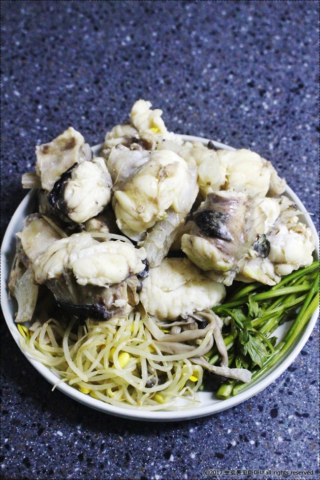 아귀 수육에 들어갈 채소로는 콩나물, 미나리, 느타리버섯 요렇게 셋 준비했습니다.