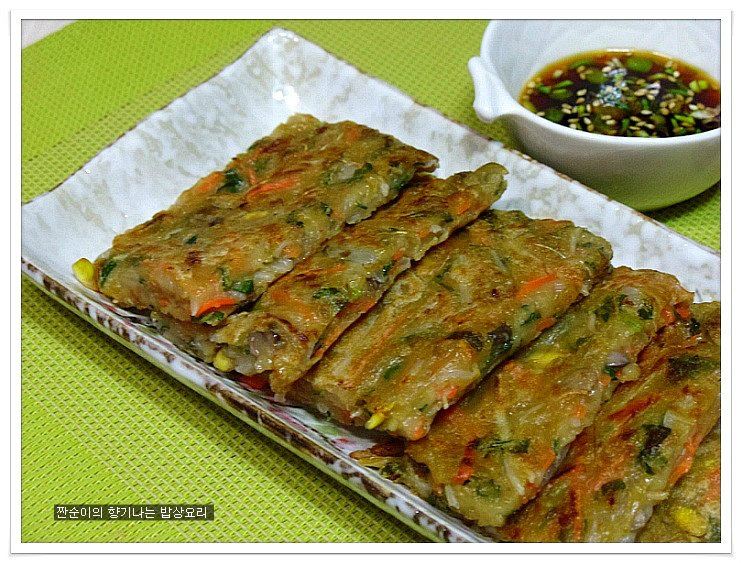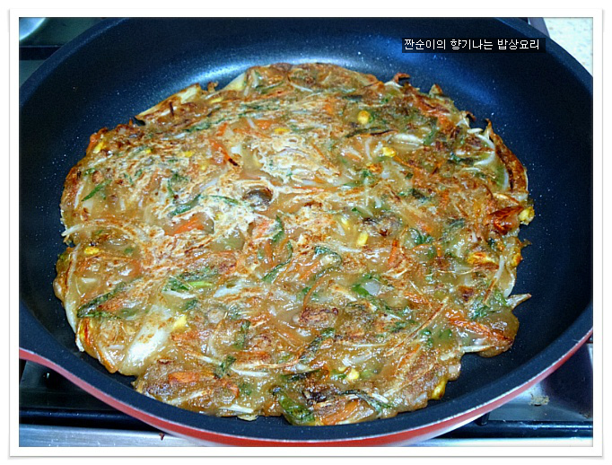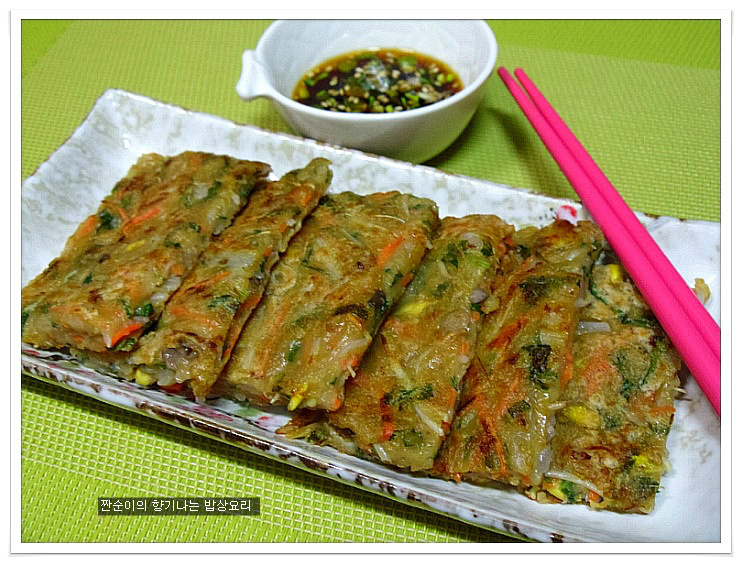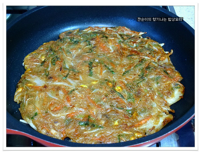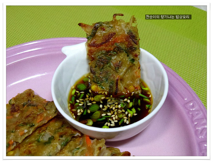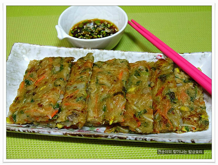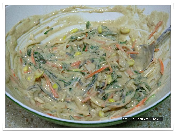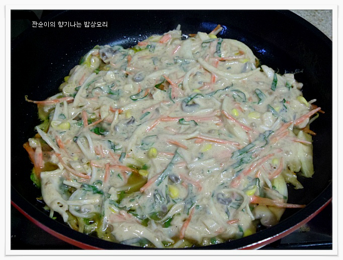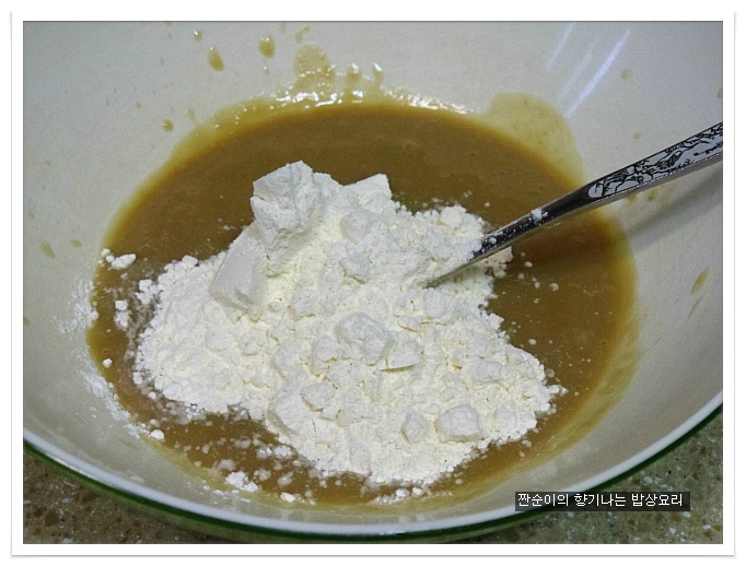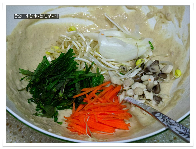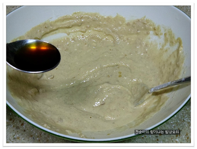 여기에 소금간 대신 국간장1큰술정도 넣어주어 간을 줍니다 일반전에 소금간을 하는것보다 국간장을 넣어주는게 더 깊은맛이 있어요