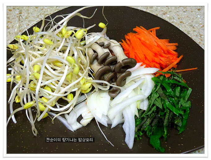 도토리전에 들어갈 콩나물과 느타리버섯 당근 깻잎 양파를 썰어 준비하구요 콩나물도 서너번 잘라 준비해요 여기에 오징어도 썰어넣어주면 딱인데 오징어가 없는관계로 생략했네요