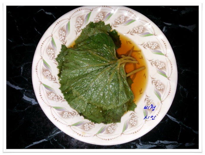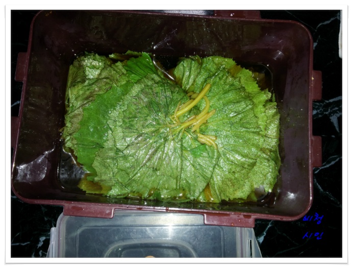 머위잎을 건져 국물을 한번더 끓여 식혀 붓습니다 (오래두고 먹을경우)