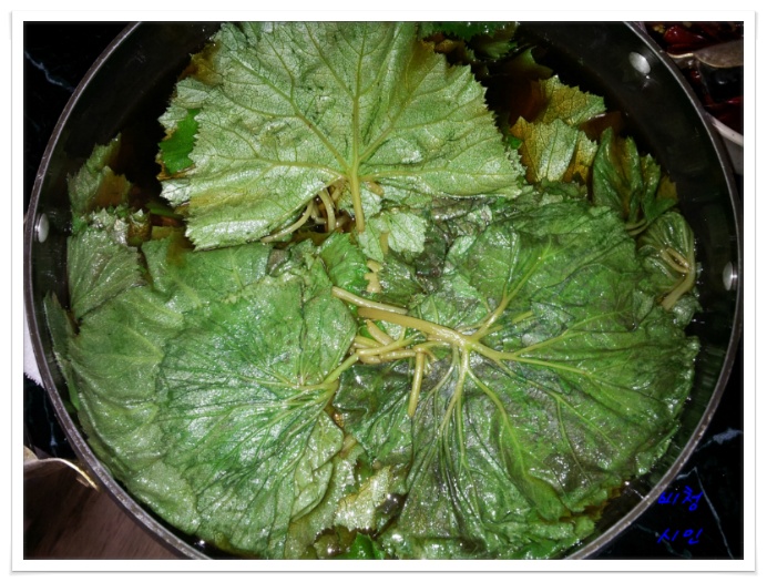 머위잎을 솥에 재웁니다