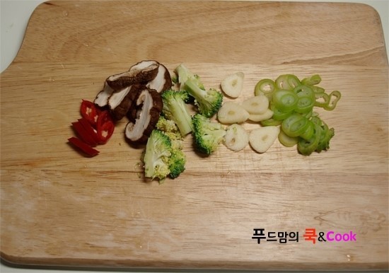 표고버섯은 밑둥을 떼어 낸 후 채 썰고 홍고추 브로콜리도 썰어 준비합니다