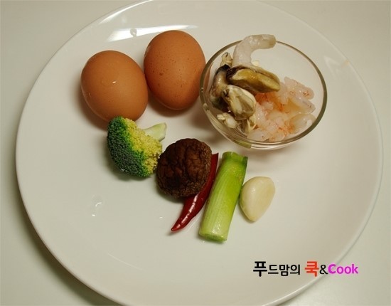 재료는 달걀 2개, 표고버섯 1개, 마늘 1쪽, 대파.브로콜리.홍고추 약간씩 들어 갔어요.
