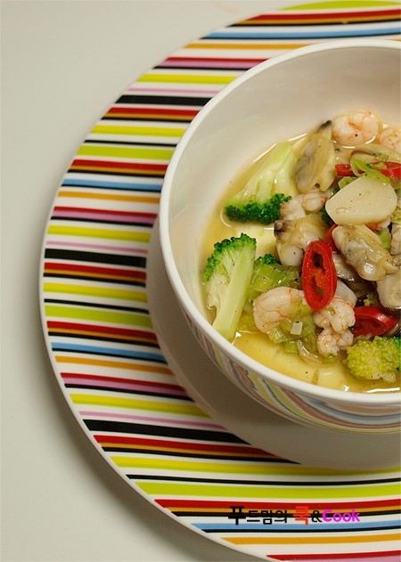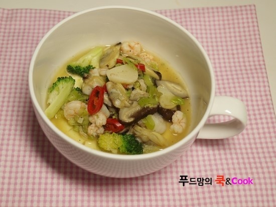 해물과 야채를 넣고 청주와 물 1/3컵 정도를 넣어 끓입니다
