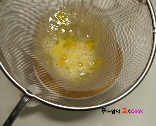 계란은 알끈을 제거하고 1/3분량의 물과 섞은 후 체에 내립니다.
