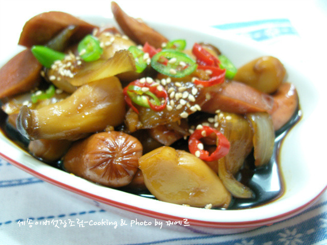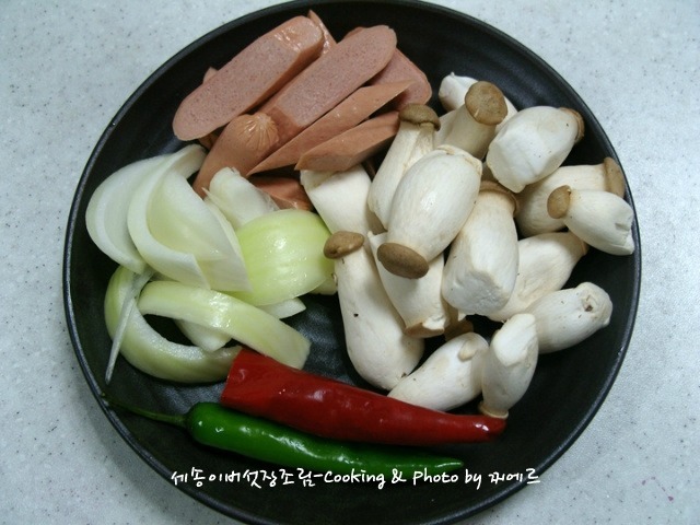 * 재료=> 미니새송이버섯 한줌/프랑크소세지2개/양파반쪽/다진마늘 1/2큰술/청,홍고추