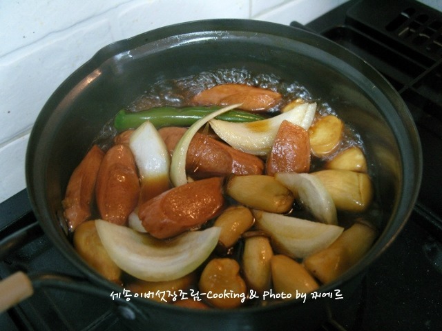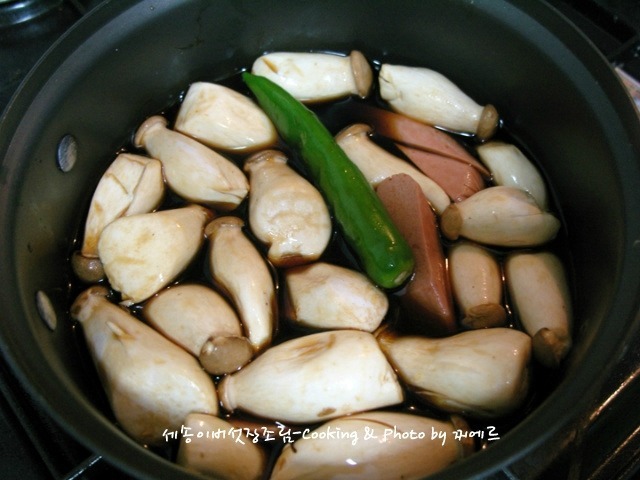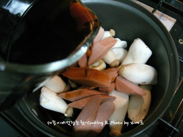 냄비에 새송이버섯과 소세지를 넣고 분량의 양념장을 부어줍니다.
