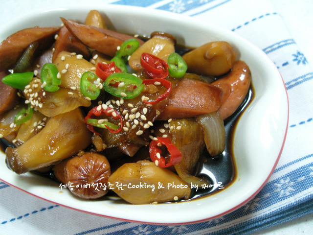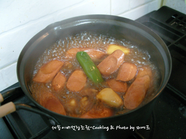 메추리알이 없는 관계로 부대찌게 끓이고 남은 프랑크소세지와 졸였어요..
