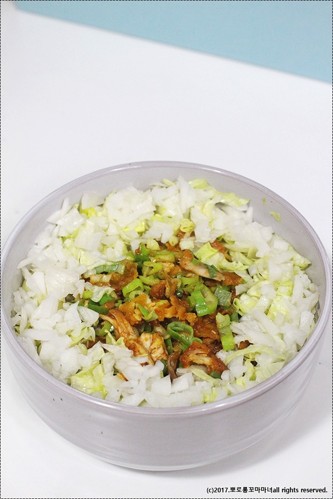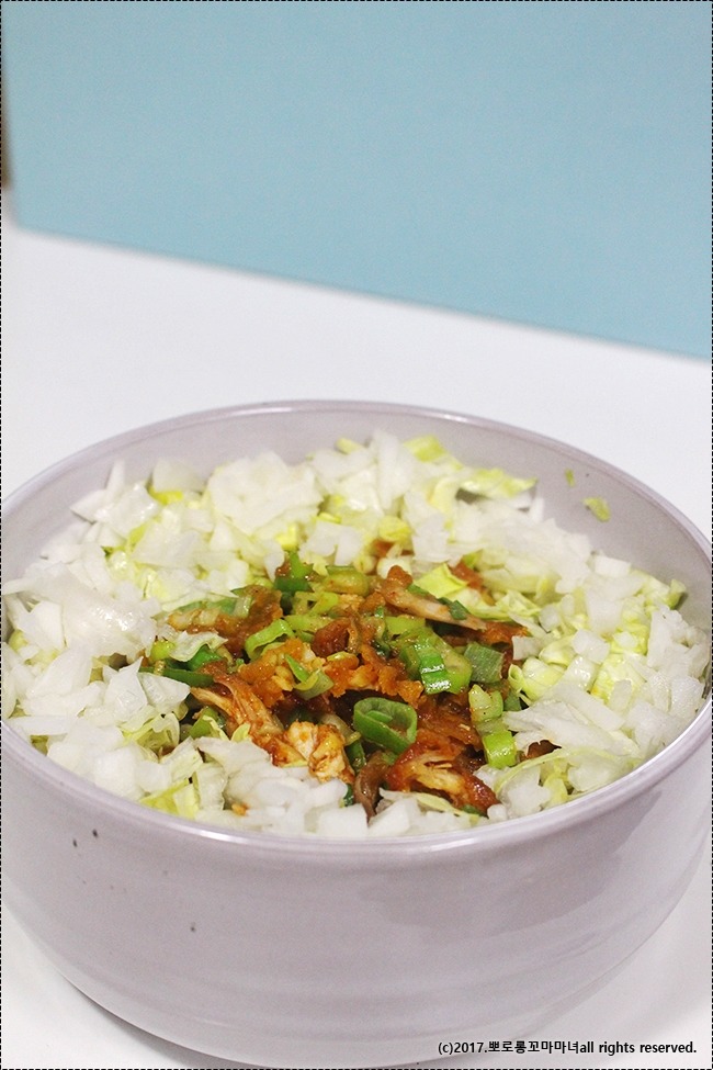 요 대파와 양념치킨 살 발라낸 것을 넣고 잘 섞어주세요.