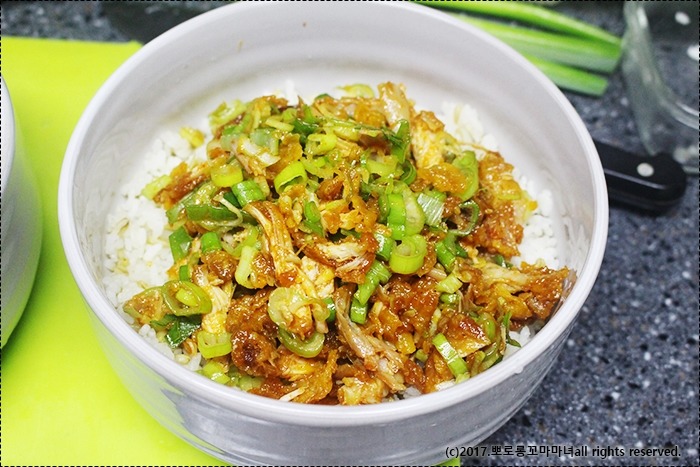 찬밥 위에 미리 파와 버무려놓았던 치킨을 올리고..