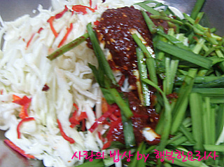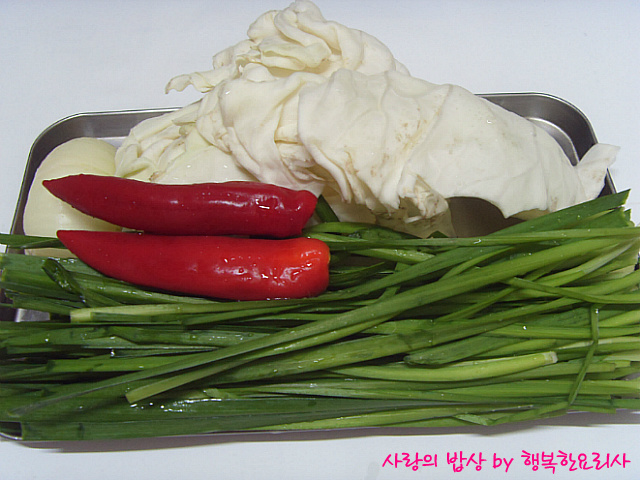 양배추5장,부추1줌,양파1/2개(소)홍고추2개,통깨 약간.