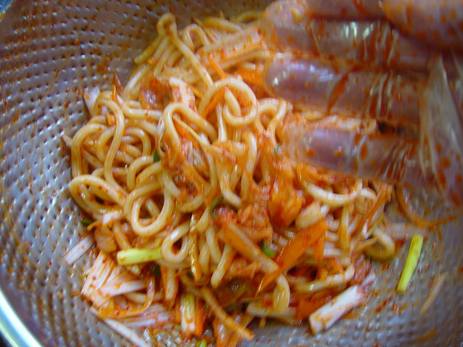 우동은 국수처럼 팍팍 버무리다보면 면이 끊어지므로 스리살짝~손에 힘을 빼고 무쳐주세요.