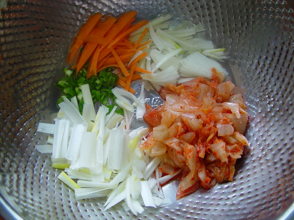 먼저 김치를 쫑쫑 썰어주시고 야채도 채 썰어 준비해둡니다.
