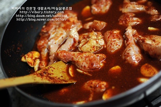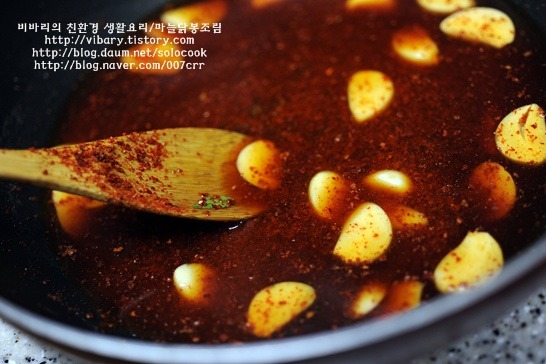 4,양념장에 마늘먼저 넣고 한소끔 끓으면 닭을 넣고 보글보글 끓이다가