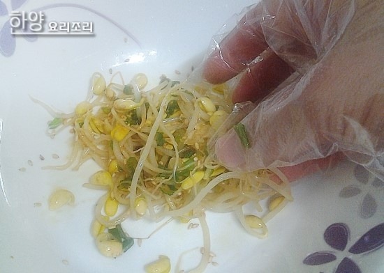 물기 뺀 콩나물에 간장,소금,참기름,깨를 넣고 조물조물 무쳐줍니다.