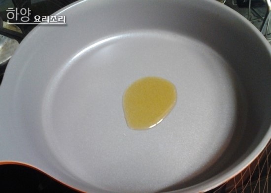 달군팬에 참기름을 둘러 줍니다.