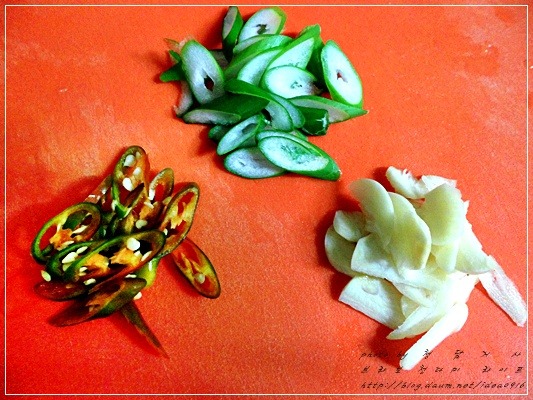 청, 홍고추, 파와 마늘은 아주 얇게 슬라이스를 냈구요.