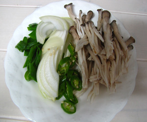재료 : 삼겹살, 느타리버섯, 양파, 대파, 다진마늘, 청량고추, 깻잎, 고춧가루, 후춧가루, 식용류, 신김치, 굴소스약간...