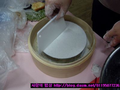 6. 시루나 찜기의 밑에 시루밑을 깔고 쌀가루를 고루 펴서 담는다.