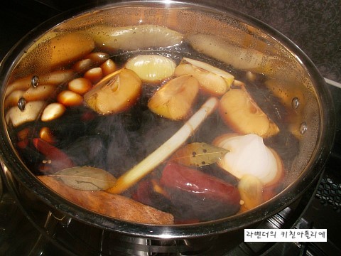 건고추2,통후추 1T,매실액 4T, 월계수잎 2,커피1t, 말린갈근 1쪽 푹~끓여 식혀줬어요~