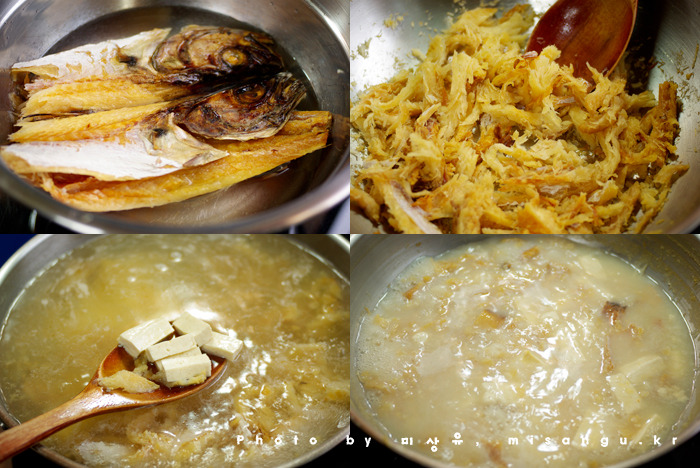 Tip. 오늘은 물과 황태포를 사용했습니다. 사골국물이 아니어도 뽀얀 국물이 나와요.