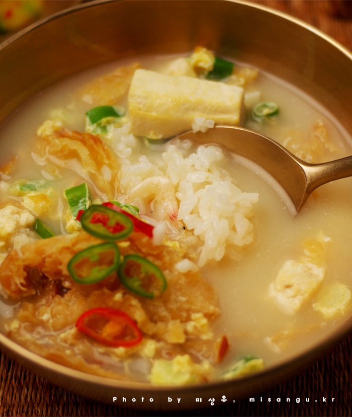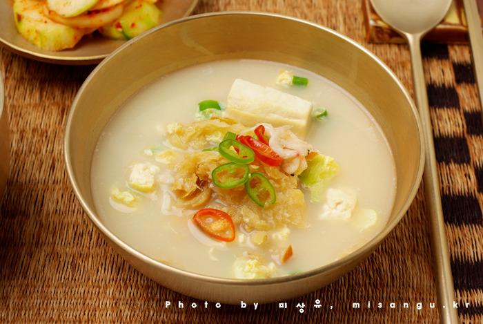 재료: 북어포 혹은 황태포 1장, 두부 1/3모, 대파 1뿌리, 달걀 1개, 물 혹은 묽은 사골육수 8컵, 참기름 1큰술 반,