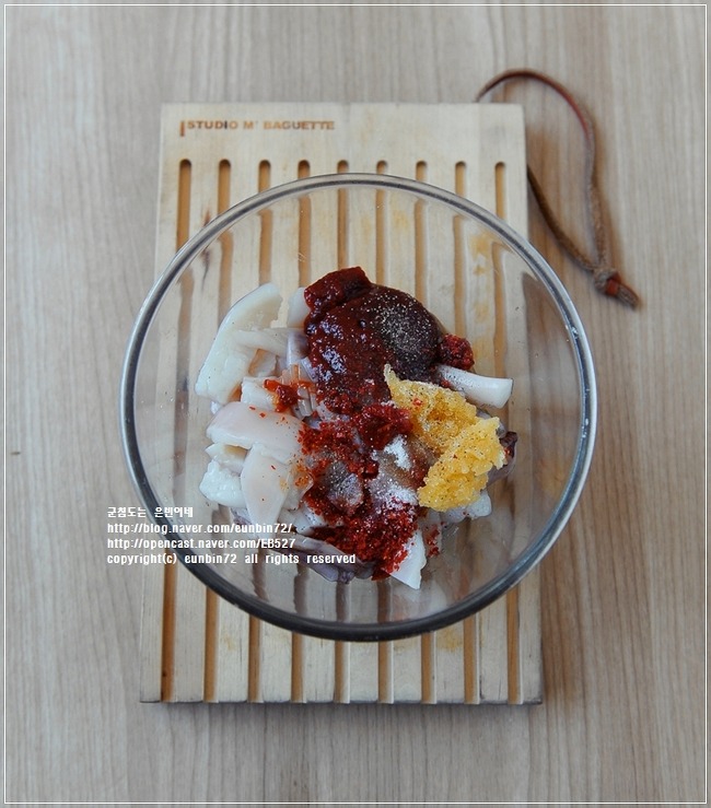 오징어 양념 - 고추장1과1/2큰술, 고춧가루1큰술, 맛술1큰술, 물엿1큰술, 다진마늘1큰술, 후춧가루약간