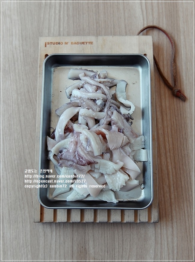 오징어는 내장을 제거하고 껍질을 벗긴후 깨끗이 씻어 물기를 제거하고 먹기좋은 크기로 잘라주세요