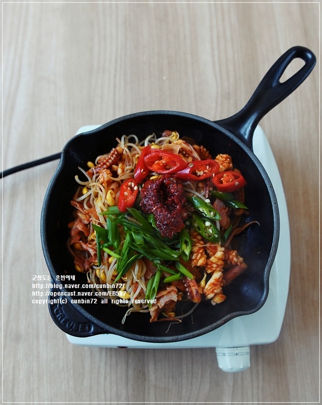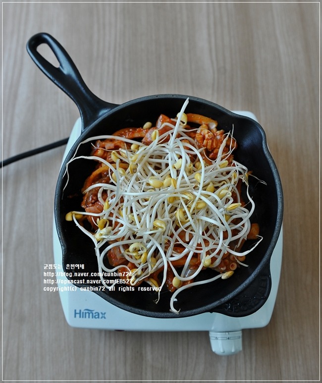 오징위에 콩나물을 얹은후 후라이팬의 뚜껑을 덮고