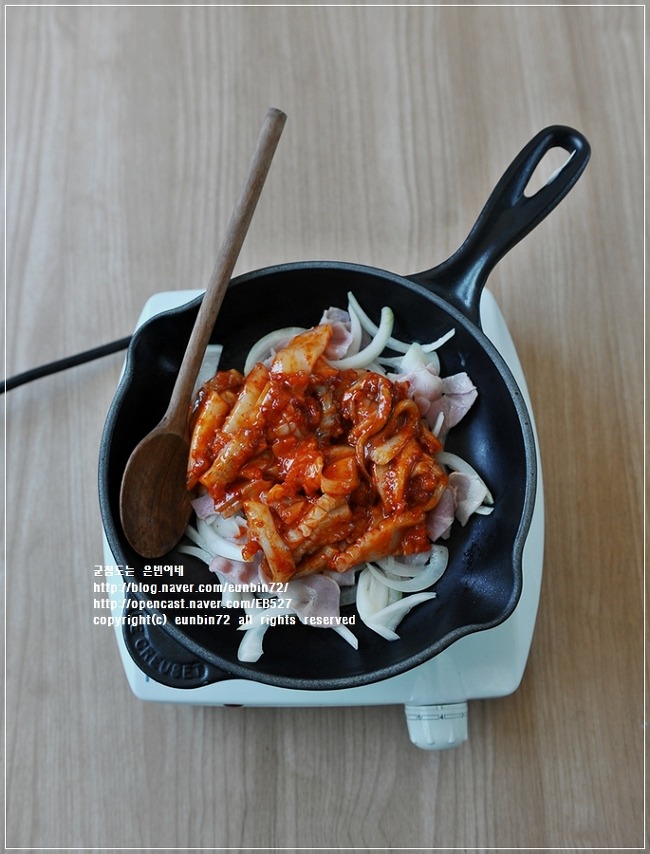 양파가 반정도익으면 양념에 재워두었던 오징어를 넣고 함께 볶아줍니다