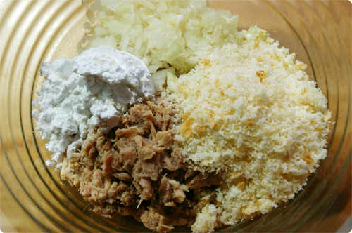 그릇에 참치, 다진양파 2큰술, 빵가루 4큰술, 감자전분 1+ 1/2큰술을 넣고 뭉쳐 줍니다.