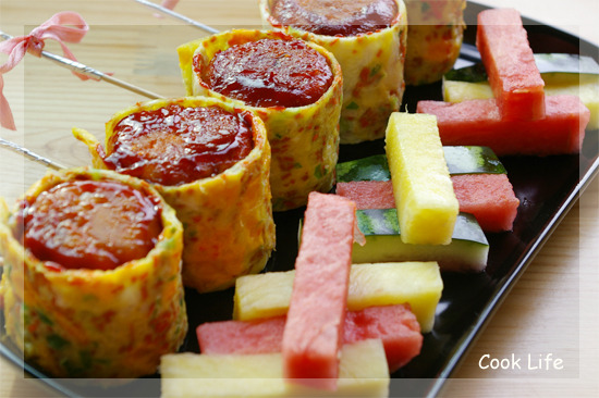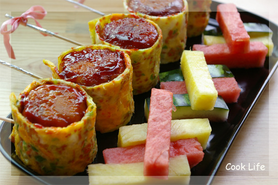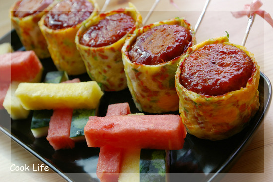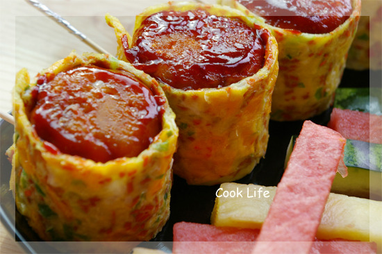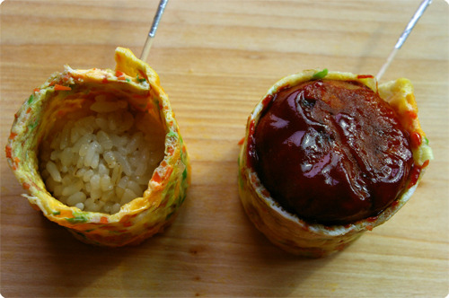 빚어 놓은 밥에 잘라 놓은 계란지단으로 동그랗게 맙니다.