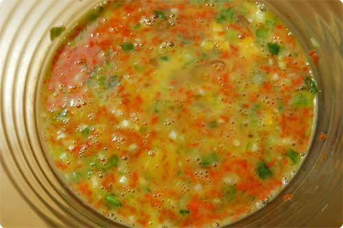 계란 2개를 풀어 잘게 썬 당근, 파, 슬라이스치즈, 소금을 넣어 섞어 줍니다.