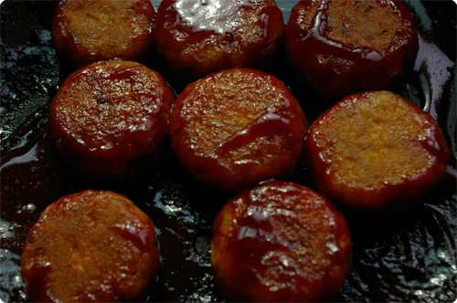 그 위에 고추장으로 양념을 입힌 참치동그랑땡을 놓으면