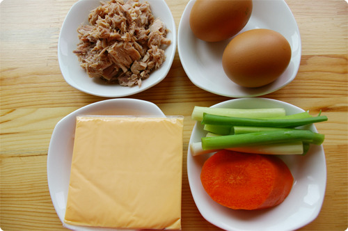 참치 1통(150g), 계란 2개, 슬라이스치즈 1장, 파 1대, 당근 1/5