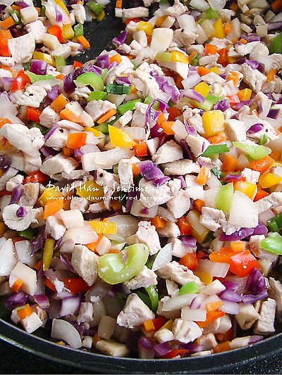달궈진 팬에 기름을 두르고 닭가슴살과 채소들을 볶다가