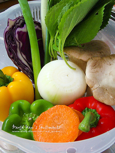 채소들은 잘~ 썰어 주시구요. 깻잎,대파는 나중에 넣을거라 따로 준비합니다.