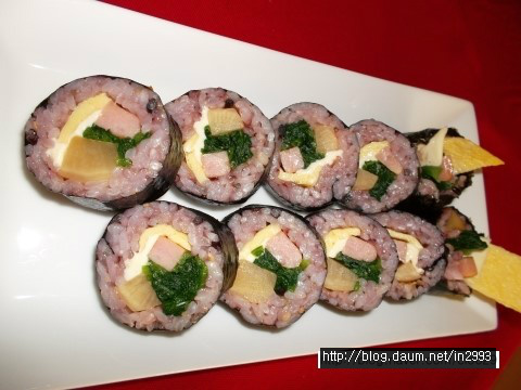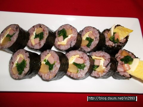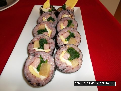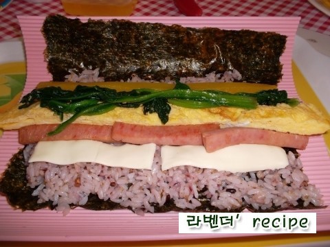 김 위에 밥을 2/3이상 얇게 펼친다음 석박지,계란지단,햄,치즈,시금치 올리고