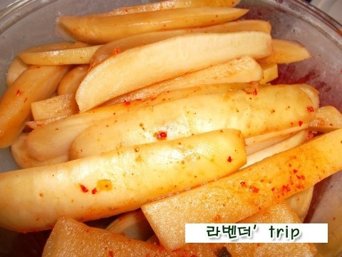따로 양념을 한게 아니라 김장김치통에 담궈둔 석박지이므로 빨갛지않고 단면은 꼭 단무지처럼 보이네요,,