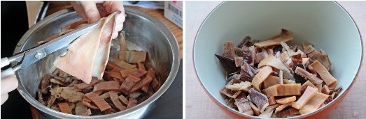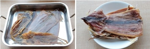 마른오징어는 물에 담궈서 하룻밤정도 무르게 불려준다