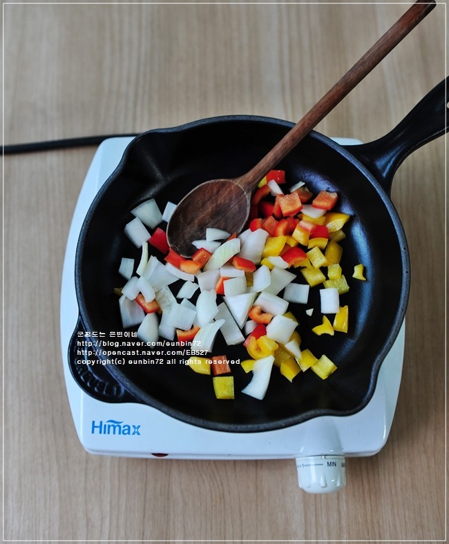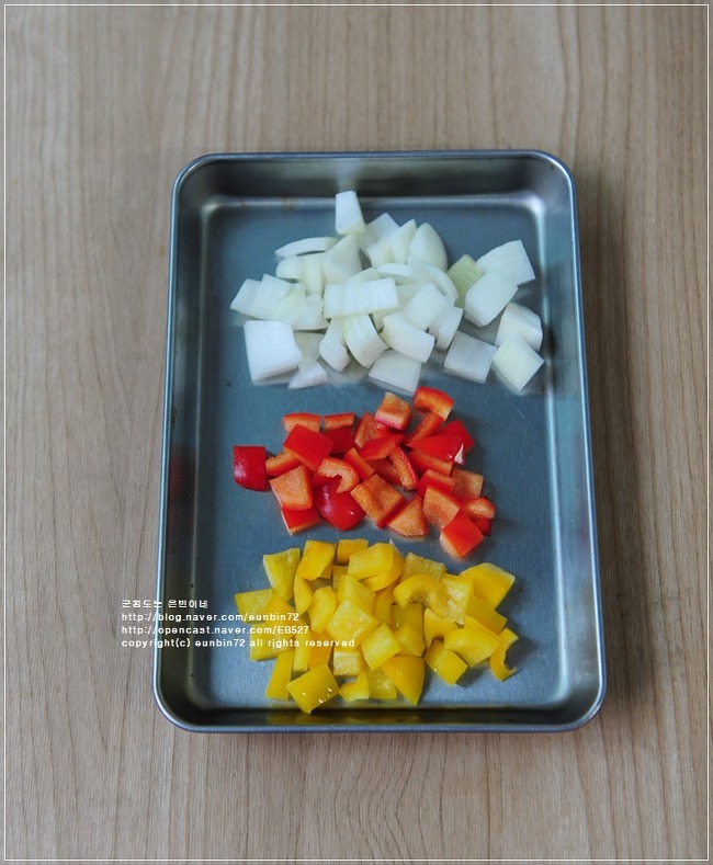 양파랑 파프리카는 새끼손톱 크기로 잘라주세요
