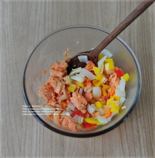 볼에 연어캔과 볶은 채소를 넣고 고루섞어주세요