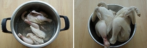 녹차잎 끓인물에 청주넣고 손질한 영계두마리 살짝 데쳐낸다