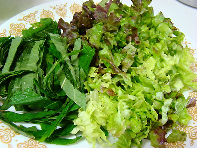 깻잎과 상추는 깨끗이 씻어서 물기를 뺀 다음 5mm정도로 채 썰어 둡니다.