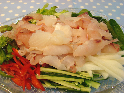 접시에 준비한 야채를 골고루 깐 다음 회를 보기 좋게 얹어 줍니다.