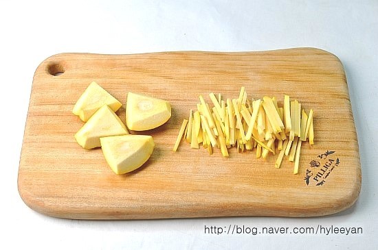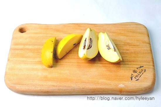 씨앗을 빼낸 모과는 납작하게 편으로 썬 다음