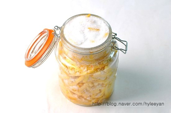 자주 밑바닥에 가라앉은 설탕을 고루 섞어주어야 고르게 절여져요.