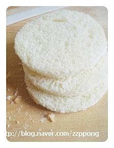 1.먼저 식빵을 컵으로 눌러서 동그랗게 잘라주어요.요렇게~