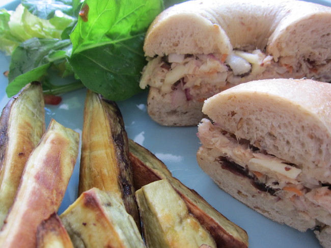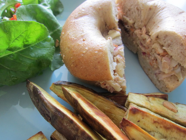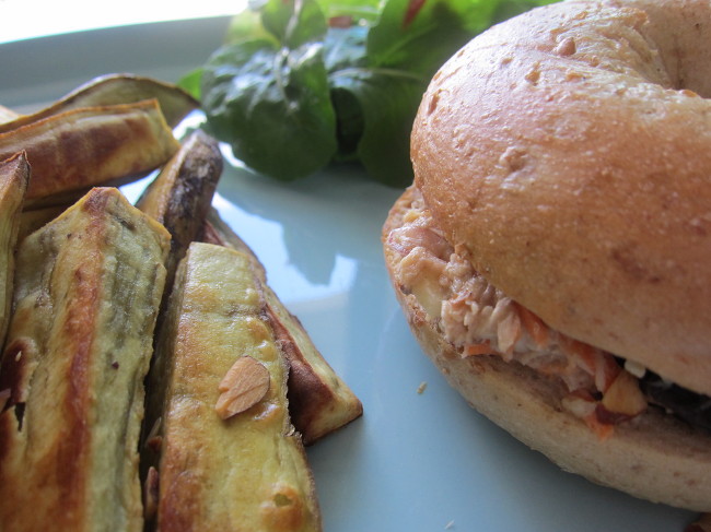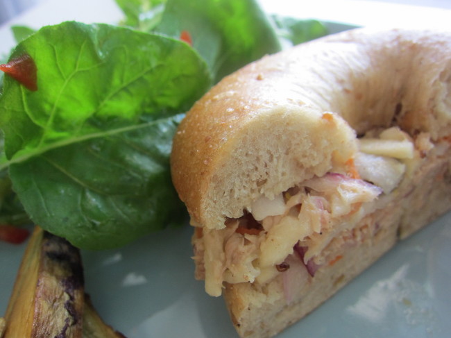 살짝 구운 베이글에 넣어주세요.다른 빵을 쓰시려면, 빵에 마요네즈를 발라 속을 채우시고,